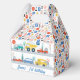 Farbenfrohe Straßenschilder Transport Birthday Gefallen Box Farbige Junge Transport Gunst Box mit verschiedenen Fahrzeugen auf zwei Reihen der Straße. Dieses Verkehrskonzept umfasst einen Müllwagen, Schulbus, Van, Sportwagen sowie ein Straßenschild.