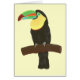 Malerei eines farbenfrohen Toucan-Vogels auf einem Ast, auf Karten gedruckt. Die Hintergrundfarbe kann angepasst werden. Der Toucan ist ein schöner und farbenfroher tropischer Vogel. Der Schnabel ist breit und hat fünf verschiedene Farben. Der Absturz unterhalb des Nackens ist gelb und in rot eingetrimmt. Der Rest seiner schwarzen Federn scheint sein lebendiges Gesicht zu zeigen. Der Toucan ist ein schöner Vogel, ein schönes Farbenspiel in der Natur.