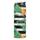 Niedlicher tropischer Papagei und gelbe Blumen über Schwarz-weiße Streifen