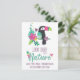 Diese Postkarte ist in einem hübschen tropischen Farbdruck mit einem niedlichen Cartoon-Touch, farbenfrohen tropischen Blätter und Blume und einem kleinen rosa Vogel gestaltet. Der Titel, aus Einstein, lautet "Schau tief in die Natur und du wirst alles besser verstehen", in lila und hellblauen Schriftart.