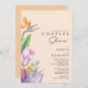 Diese farbenfrohe tropische Blüte | Pfirsichdusche ist perfekt für Ihr modernes boho Ziel grün, lila, Pfirsichdusche. Das Design besticht durch ein elegantes Bouquet mit klassischen Aquarelltönen und Blume, darunter ein schlängelgrüner Eukalyptus, Lila und rote Protea, ein rot-rosa Hibiskus, ein orangefarbener und blauer Paradiesvogel und ein dunkelgrünes Palmenblatt. Das Design ist ideal für eine einfache, kreative, einzigartige Reise Hochzeit für Frühling, Sommer, Herbst oder Winter! In der Erholung der Sammlung finden Sie weitere passende oder koordinierende Hochzeitsstätten.