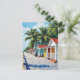 Sage ihn mit dieser schönen Urlaubspostkarte mit einer ai-Abbildung der Hütten am Brett, die durch den Ozean umgeben von Palmen laufen. Ein hübsches, lebendiges, impasto Öl Stil ai Gemälde.