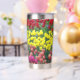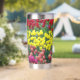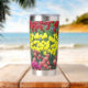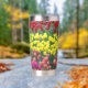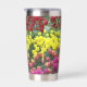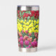 Ein trendiger Edelstahl-Thermalwäscher für Ihre warmen oder kalten Getränke, der ein umgehendes Foto-Image eines bunten, Frühlinggartens mit roten, gelben und rosa Blüten aufweist. Ein schönes Blumendesign!