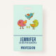Namensschild mit einem Trio niedlicher und skurriler, von Hand gezeichnet Vögel. Zwei der Vögel sind stehend, zusammen mit ein paar winzigen grünen Pinienbäumen zwischen ihren Füßen. Ein anderer blauer Vogel fliegt in der Luft zwischen ihnen hoch. Minz grüner Hintergrund.