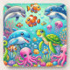 Eine lebendige Unterwasser-Illustration, in der verschiedene Meerestiere, darunter Delfine, Meeresschildkröten und Oktopoden, unter Korallen und Blasen dargestellt werden, um das Glück und die Schönheit des Ozeanlebens zu fördern.
