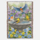 Bluebirds und Goldflossen, die in einem bunten Frühlingsblütengarten mit lila Clematis an einem weißen Zaun mit Birdbädern und den blauen und gelben Gänseblütenfarben einen angenehmen Aufenthalt verbringen. Artwork von Wildtieren und Pferdekünstler Crista S. Forest.