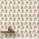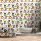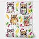 Niedliche Uhus und fallende Blätter in der Illustration Tapete in braun, rosa, grün, blau und gelb. Niedlich für ein Kinderzimmer, ein Kinderzimmer oder ein Zimmer in einer Hütte im Wald.
