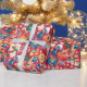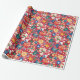 Fröhliche festliche Verpackungspapier mit einem farbenfrohen Weihnachtsmuster auf rotem Hintergrund.