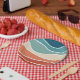 Abstrakte Retro-Darstellung der farbenfrohen Wellen (rot, blau, orange, marineblau, beige, türkis) auf weißem Hintergrund. Sie können Ihren Namen/Monogramm hinzufügen, um das Objekt zu personalisieren.