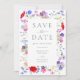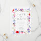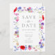 Einzigartig handgemalte, farbenfrohe Aquarellkunst aus der Wildblume, ein modernes und dennoch elegantes Hochzeitsdesign Save the Date, um Ihre Freunde und Familie zu begeistern, Save the Date für Ihre Hochzeit im Frühjahr oder Sommer. Einfach zu personalisieren Vorlagen für Details mit modernen eleganten Typografie-Skripten in Schiefergrau und Monogramm Initialen der Braut und Bräutigam auf der Rückseite der Einladung. Zu den kuscheligen Wildblumen des Sommers zählen Pfeffer, Maisblumen, vergiss mich Knoten, Knöpfe und Kosmos. Original-Kunstwerk von Künstlerin Catherine Sweetman mit staubblauen, kornblauen, rosa, lila, Lavendel, Pflaume, Bordeaux, Gelb, Pfirsich, Grün und Rot, um wunderschöne Illustrationen über die Wildblume der Wiese zu erstellen.