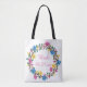 Hübsche, farbenfrohe Rosa-, Blau- und Gelbblumen, die in einem Kreissaal mit einem Platzhalter für Braut oder Namen und dem Hochzeitstag angeordnet sind, werden auf Taschen für die eigenen Toten gedruckt. Der Text kann auf dem Vorlagenformular leicht personalisiert werden. Das Blumendesign ist in einem kleineren Muster auf der Rückseite der Tasche gefliest. In diesem Geschäft sind passende Artikel vorhanden. Vielen Dank für Ihren Einkauf bei CherylsArt auf Zazzle.