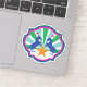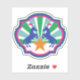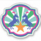 Ein Motiv, das von Vintagen Zirkusplakaten inspiriert wird, die ein blaues, geplattetes Set mit einer türkisfarbenen und grünen Sternexplosion mit einem orangefarbenen Stern darstellen, wird auf einem konditionierten Vinyl-Aufkleber dargestellt.