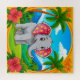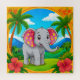 Ein fröhlicher Cartoon-Elefant, stehend in einer lebhaften tropischen Umgebung mit bunten Palmen, blühenden Hibiskus-Blume und einer sonnigen Kulisse, die eine lebendige und fröhliche Atmosphäre schafft.