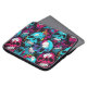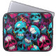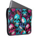 farbenfrohe und chaotische Schädelmuster. Die Schädel sind überwiegend blau mit verschiedenen Rosa- und lila Spritzern und Tropfen. Einige Schädel haben Zähne und gebrochene Knochen, was die grauenhafte und makabre Natur des Bildes erhöht. Der Hintergrund ist schwarz, was dazu beiträgt, die Schädel zu markieren und die Farben zu Pop zu machen.