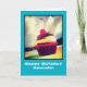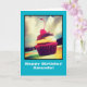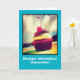 Personalisiert Happy Geburtstag Gruß mit einer anpassbaren Nachricht innen. Ein helles sommerliches Foto eines köstlichen Kuchens. Dieses Bild hat weiße flauschige Wolken und Berge im Hintergrund. Der leckere Kuchen ist in einem hellrosa und lila roten Wrapper enthalten. Der Cupcake selbst ist eine Kombination aus Vanillekuchen und Schokoladeneis mit einer saftigen Kirsche oben mit einem langen roten Stamm. Der Cupacake sitzt auf einem farbenfrohen Tischdecken in einem geometrisch quadratischen gesteppten Muster mit hellen Retro-thematischen Farben. Dieses Bild schreit nur Party im Sommer!