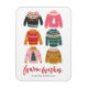 Schenken Sie Ihren Lieben mit unserem farbenprächtigen Urlaubsmagneten den Feiertag! Der Non-Foto-Magnet verfügt über 6 niedliche und farbenfrohe, hässliche Pullover in einer Farbpalette aus Rosa, Rot, Grün und Gold. Der Satz "Warme Wünsche" wird unten in einem roten, handgeschriebenen Skript angezeigt. Personalisieren Sie den Magneten, indem Sie Ihren Namen oder benutzerdefinierten Text hinzufügen.