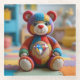 Dieses charmante und lebendige Filzkunstwerk, das vor allem durch Nadelfilzen geschaffen wurde, zeigt einen fröhlichen Patchwork-Teddybär, der glücklich im Kinderspielzimmer sitzt. Der Bär besteht aus farbenfroher Wolle, die in Rot-, Blau-, Gelb-, Grün-, lila- und Orangetönen rotiert, und weist eine Gesteinsform auf, die durch sichtbare Stiche, die die Farbflecken miteinander verbinden, gekennzeichnet ist. Sein süßes Gesicht hat schwarze perlenartige oder gekochte Augen und eine hellrote, herzförmige Nase. Die Pfoten sind mit weich gestrickten weißen Pads versehen, und der Bauch zeigt einen sorgfältig nadel-gefilzten Prismendiamanten, der aus lackierten weißen, risierenden und seidenartigen Fasern hergestellt wird. Dies schafft einen funkelnden, facettierten Effekt, der das Licht auffängt. Dieses fröhliche Stück, das auf einem bunten Schaumstoffspiel sitzt, weckt Wärme, taktile Freude und Wunder in der Kindheit, Set vor einem sanft verschwommenen Kinderhintergrund.