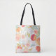 Aquarellpfirsiche und Blume Muster Tote Tasche. Der Blumenbeutel mit Aquarellbildern von Pfirsichen, Pfannenbäumen, Eukalyptus und anderen Blüten- und Blattakzenten.