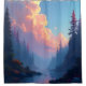 Ragende immergrüne Bäume säumen einen friedlichen Fluss, vor einem Himmel mit lebendigen rosa und orangefarbenen Wolken. Die ruhige Landschaft weckt ein Gefühl von Ruhe und Majestät, während die Sonne über dem fernen Horizont untergeht.