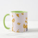 Hübsche und farbenfrohe grafische Gestaltung, rosa, lila, braun auf hellgrüne Tasse.