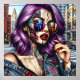 Einzigartige Ai-Kunst, die eine wunderschöne moderne Frau mit lila Haar darstellt, roter Lippenstift, Sonnenbrille mit Reflektion, gestritzelte Kunst im Stil des Pops Art Comic.