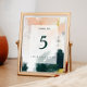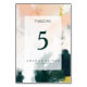 Diese farbenfrohe abstrakte Tischnummer ist perfekt für Ihre einzigartige moderne Hochzeit. Handgemalt mit strukturierten Pinselstrichen aus dunklem Smaragdgrün, Pfirsich und Senf, alles überlagert mit einem minimalistisch transparenten Quadrat, ist es sicher, Ihrem Anlass ein einfaches, aber rustikales bohemianisches Gefühl zu geben.