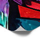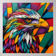 Lebhafte und bunte Adlerkunst. Der Adlerkopf ist auffällig mit fett, geometrischen Formen und kräftigen Farben dargestellt, darunter Rot, Blues, Grüntöne und Gelb. Die Federn sind mit aufwändigen Details stilisiert und zeigen eine Vielzahl von Farbtönen, die ein Gefühl von Tiefe und Bewegung schaffen. Der Hintergrund besteht aus ähnlich farbigen geometrischen Mustern, die die dynamische Gesamtkomposition verstärken. Das durchstechende Auge des Adlers verleiht dem Stück einen intensiven Brennpunkt, der Kraft und Majestät vermittelt.