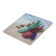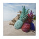 Drei farbenfrohe Ananas am Sandstrand, türkisblau, rot und blau.