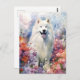 Farbenfrohe Aquarellkunst eines Samoyed sitzend in einem Feld von Frühlingsblumen.