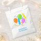Fun Geburtstag Gunst Tasche mit einer farbenfrohen Grafik von verschiedenen Formen Ballons, Streamer, Konfetti. Personalisieren Sie den blauen benutzerdefinierten Text für die Geburtstagsfeier. Ideal für alle Gastgeschenke.