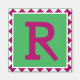 Der Hauptstadt-Buchstabe 'R' wird fuchsienfarben auf einem hellgrünen Hintergrund ausgeführt. Der Rahmen hebt sich in der fuchsienfarbenen Farbe des Briefes ab und hat ein diamantförmiges Design rund um den Rand in fuchsia und weiß.