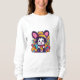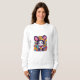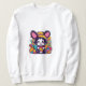 Eine niedliche Cartoon-Maus mit einem farbenfrohen Hut und Shirt sitzt in einem Stapel aus Pinsel und anderen Kunstgegenständen.