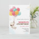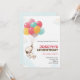 Eine Geburtstagseinladung mit einem Cartoon-Hund, der von farbenfrohen Luftballons in die Höhe gehoben wird. Der Text lautet "Josephs 6. Geburtstag" mit den Details des Ereignisses darunter. Der Ton ist fröhlich und spielerisch.