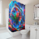 Dieser Duschvorhang hat einen farbenfrohen Fisch darauf.