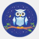 Illustration einer stilisierten geometrischen Eule, die auf einem Ast unter den Sternen sitzt und eine ruhige, nächtliche Szene mit lebhaften Farben und künstlerischem Design darstellt, die Ruhe und Charme einnimmt.