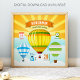 Poster zur Geburtsankündigung für das Babyzimmer mit moderner Typografie und süßen Heißluftballons vor einem strahlenden Sonnenaufgangshintergrund. Fügen Sie alle Ihre liebsten Details zu dieser benutzerfreundlichen Vorlage hinzu, um Ihre eigene einzigartige Geburtsstatistik zu erstellen.