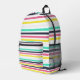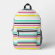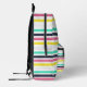 Ein Rucksack mit einem farbenfrohen gestreiften Muster. Der Rucksack hat zwei Halterungen, um die Schultern zu tragen. Die Streifen sind in verschiedenen Farben gehalten, darunter Gelb, Rosa, Blau und Schwarz. Die Hintergrundfarbe ist weiß. Auf der Vorderseite des Rucksacks befindet sich eine kleine Tasche mit Reißverschluss.