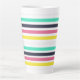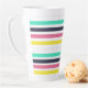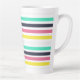 Eine farbenfrohe, latte Tasse mit gestreiftem Muster, vorwiegend weiß mit horizontalen Streifen in Schwarz, Rosa, Gelb und Türkis.