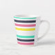 Eine farbenfrohe, latte Tasse mit gestreiftem Muster, vorwiegend weiß mit horizontalen Streifen in Schwarz, Rosa, Gelb und Türkis.
