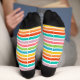 Diese komfortablen Socken aus Crew sind mit einem dynamischen, horizontalen Streifen in einem farbenprächtigen Regenbogen (Rosa, Orange, Gelb, Grün, Blau, Lila) versehen. Ideal für den Alltag, egal ob Sie sich beim Zuhause entspannen, Aufträge ausführen oder sich für einen besondere Anlass verkleiden. Das fröhliche Design wird den Tag angenehm gestalten.