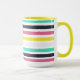 Eine farbenfrohe Dose kühler mit gestreiften Mustern. Die Tasse ist überwiegend weiß, die Streifen sind schwarz, rosa, gelb und türkisfarben. Es wurde für eine normale Getränkedose entwickelt.