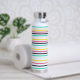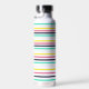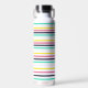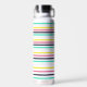 Eine moderne, minimalistische Wasserflasche. Eingestreift (blau, weltraum kadett), (weiß, rosa, lila, Cyclamen), (gelb, Aureolin), (weiß, grün, saisalt) und türkis. Fünf mehrfache horizontale Farbbänder. Das Hotel ist elegant und funktionell, ideal für jeden Drink.