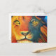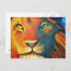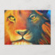 Eine Postkarte mit einem Ölgemälde von einem nahen Löwengesicht mit üppiger Mane und durchdringenden gelben Augen. Die dominierenden Farben sind orange und gelb.