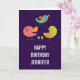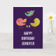Eine Geburtstagskarte mit einem Trio aus niedlichen und skurrilen, von Hand gezeichnet Vögeln. Zwei der Vögel sind stehend, zusammen mit ein paar winzigen grünen Pinienbäumen zwischen ihren Füßen. Ein anderer blauer Vogel fliegt in der Luft zwischen ihnen hoch. Set auf lila Hintergrund.