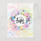 Farbenfroher Osterkunstkranz mit bunten Ostereiern und weißen und violetten Blumen mit einem Abzeichen mit Osterkalligraphie-Skript. Eine farbenfrohe Aquarellfärbung im Hintergrund. Drücken Sie Anpassen, um Ihre eigene Touch und Nachricht hinzuzufügen.