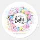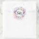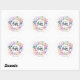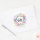 Farbenfroher Osterkunstkranz mit bunten Ostereiern und weißen und violetten Blumen mit einem Abzeichen mit Osterkalligraphie-Skript. Ein fröhliches und hübsches, farbenfrohes Osterdesign. Personalisieren Sie den Text, indem Sie ihn ändern.