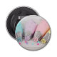 Flaschenöffner mit hübschem pastellfarbenem Foto. Die Kuchendekoration ist in Pastellblau, Rosa, Pfirsich und Gelb gehalten. Set auf einem Holztisch mit kleinen bunten Perlen.