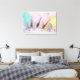 Leinwand mit einem hübschen pastellfarbenen Foto. Die Kuchendekoration ist in Pastellblau, Rosa, Pfirsich und Gelb gehalten. Set auf einem Holztisch mit kleinen bunten Perlen.