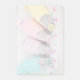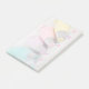Sticky Noten mit einem hübschen pastellfarbenen Foto. Die Kuchendekoration ist in Pastellblau, Rosa, Pfirsich und Gelb gehalten. Set auf einem Holztisch mit kleinen bunten Perlen.