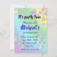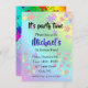 Farbenfrohe Jigsaw-Puzzles-Stücke Einladungskarte. Farbenfrohe Rätsel auf weißem Hintergrund, Name des Kindes in hellblauer Farbe. Puzzleteile in den Farben blau, gelb, grün, rosa und blau machen dieses Design perfekt für Mädchen und Jungen